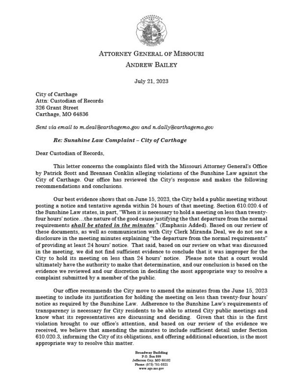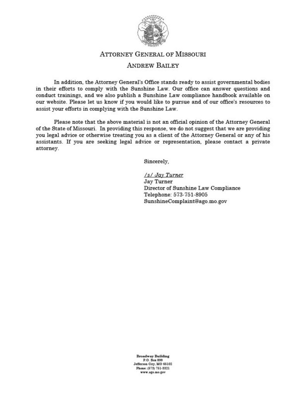 The attached letter is from the Missouri Attorney General's office in response to alleged Sunshine Law violations.